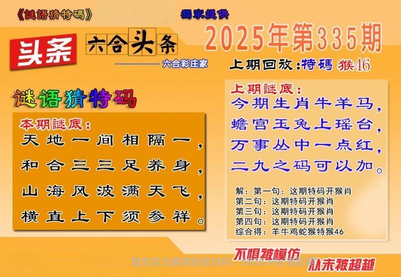 335期 天地一间相隔一 和合三三足养身 山海风波满天飞 横直上下须参祥 解译:和合三三足养身指合肖兔虎牛鼠羊马,山海风波满天飞指天肖牛马兔龙猴猪 九肖:龙鸡猴狗猪蛇牛马兔 六肖:龙鸡猴狗猪蛇 |
