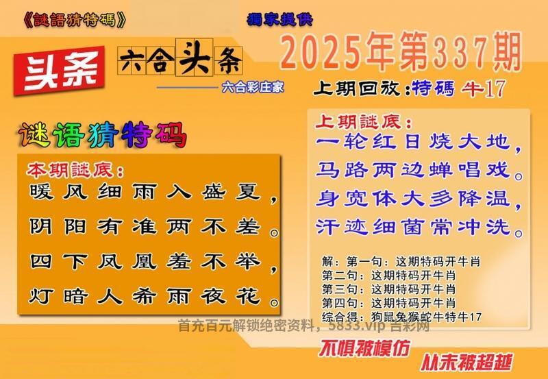 337期 暖风细雨入盛夏 阴阳有准两不差 四下凤凰羞不举 灯暗人希雨夜花 解译:暖风细雨入盛夏指风肖兔虎龙,灯暗人希雨夜花指夜肖猪狗鸡虎牛鼠 九肖:兔龙猪狗鸡虎牛鼠羊 六肖:兔龙猪狗鸡虎 特码:27.39.02.38.07.43.32.44.09.33.04.28 |