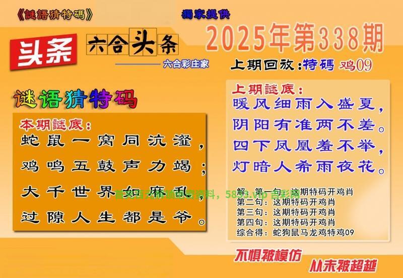 338期 蛇鼠一窝同沆瀣 鸡鸣五鼓声力竭 大千世界如麻乱 过隙人生都是爷 解译:蛇鼠一窝同沆瀣指蛇鼠,鸡鸣五鼓声力竭指鸡,大千世界如麻乱指大肖羊马狗虎猪牛 九肖:蛇鼠鸡羊马狗虎猪牛 六肖:蛇鼠鸡羊马狗 |